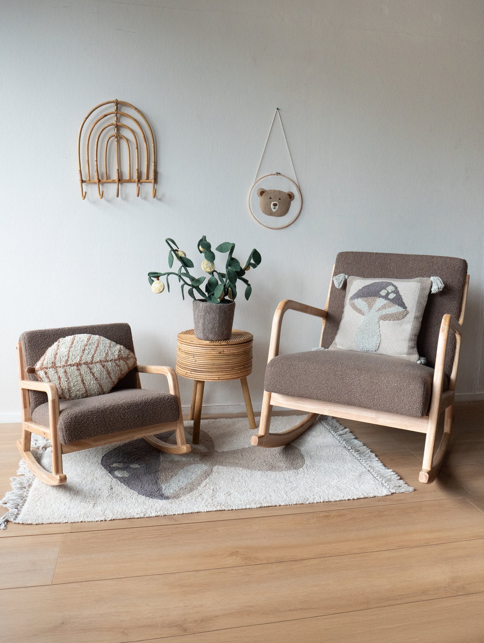 En ægte gyngestol, specielt designet til børn. Lavet af solidt, lakeret træ og udstyret med taupefarvede puder. Perfekt til afslapning, læsning eller en stille gyngetur. Kombinér den med Arvin gyngestolen til voksne for et legende og stilfuldt match mellem stor og lille!