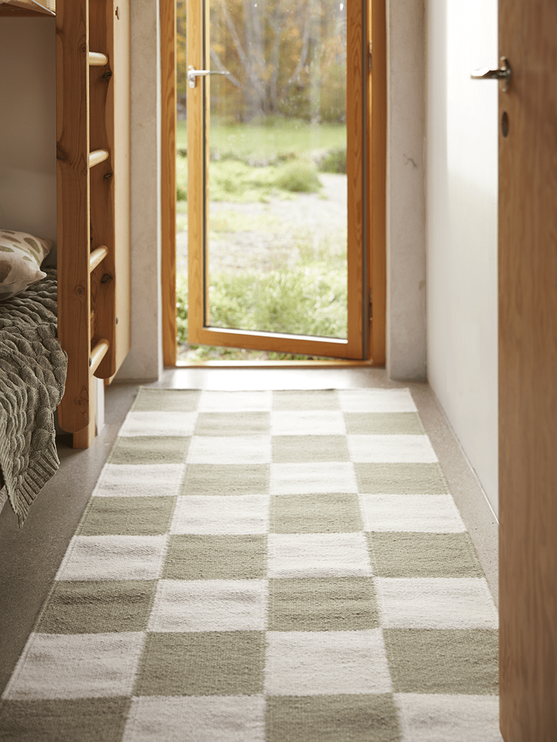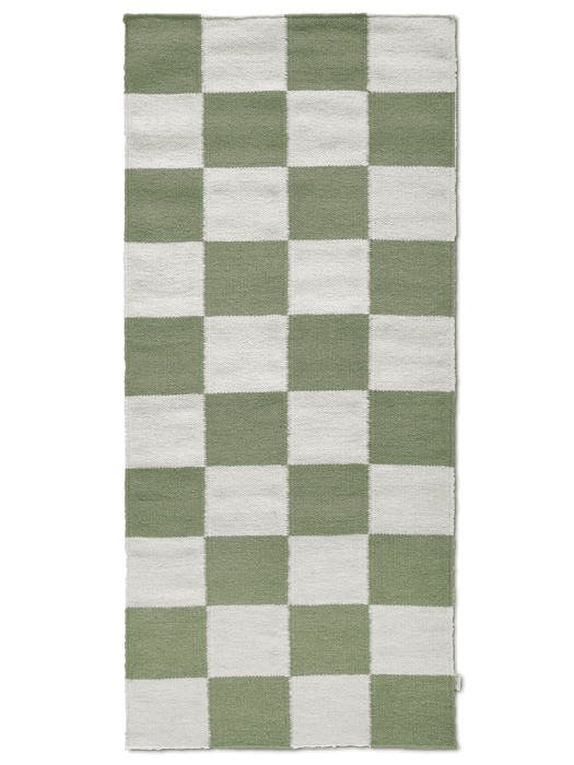 Det elegante uldtæppe har et tidløst design med grønne og hvide tern. Fremstillet af uld og certificeret af Care & Fair, der støtter fair arbejdsforhold til vævere.